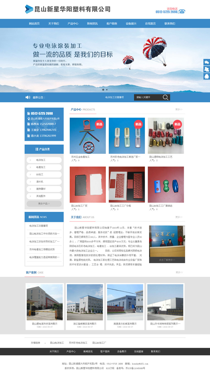 - 昆山新星华阳塑料有限公司始建于2003年12月,本着“技术进步、管理严格、品质卓越、服务优良”的 经营理念,不断开拓创新发展。目前已拥有员工300人,其中技术、质量、企业管理方面专业人员30多人 ,厂房面积6000多平方米,拥有固定资产4000万元,专业从事黑色阴级电泳及彩色电泳加工、电着加工 、ED加工最具优势。现已成为昆山市最大的电泳加工企业之一。