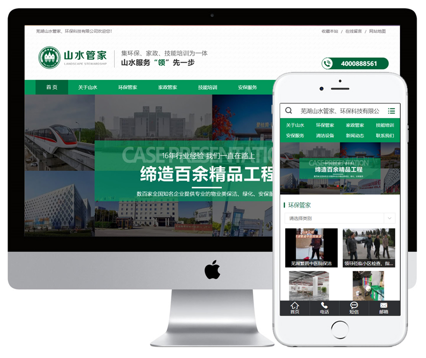 - 芜湖山水管家文化科技有限公司、芜湖山水环保科技有限公司是两家联合公司,正规注册、实力雄厚、专业从事于保洁的服务性公司。我公司拥有一批专业的管理人才和一支技术实力雄厚的员工队伍。主要从事大厦保洁、工厂保洁、开荒保洁、水电维修、家电清洗、治理甲醇、绿化养护、物业管理、疏通管道、高空作业、玻璃清洗、搬家清洗、涉及综合物业项目(环境分析测评、环境治理、城市道路和乡镇道路环卫清洁以及垃圾清运、绿化设计和实施养护、写字楼和住宅区的物业项目管理、房屋维修、安防工程的实施和维护等)。我们为各大企业,如:万科、芜湖碧桂园、无为碧桂园、南陵碧桂园、繁昌碧桂园、芜湖火车站、海螺、鑫隆国际、湾里军工企业、安展蔚然家园、居然之家、安师大、奇瑞等数百家全国知名企业提供专业的物业类保洁、绿化、安保服务。