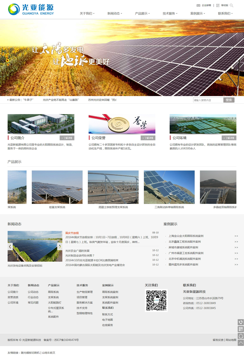 - 光亚能源科技(昆山)有限公司是专业的太阳跟踪系统设计、制造、服务于一体的高科技企业,公司始终立足产业前沿,秉持向产品要市场、向研发要未来、向管理要效益的发展理念,积极推动科学技术创新,不断提升企业核心竞争力,力争将亚新打造成全球领先的太阳跟踪系统和光伏固定支架系统集成商及运营商。公司自主设计研发的产品有双轴跟踪系统、平单轴跟踪系统、斜单轴跟踪系统及光伏固定支架系统,广泛应用于太阳能大中型地面电站和分布式光伏电站,公司拥有二十多顶国家专利和十多条自主设计研发的全自动化生产线,跟踪系统年产能1吉瓦。固定支架年产能2吉瓦。