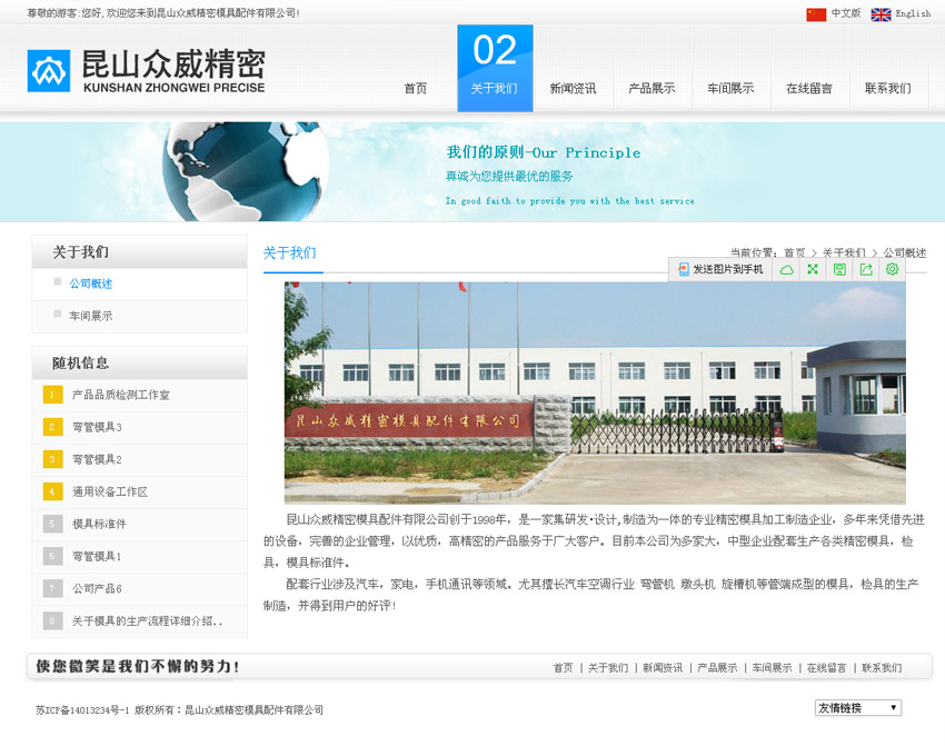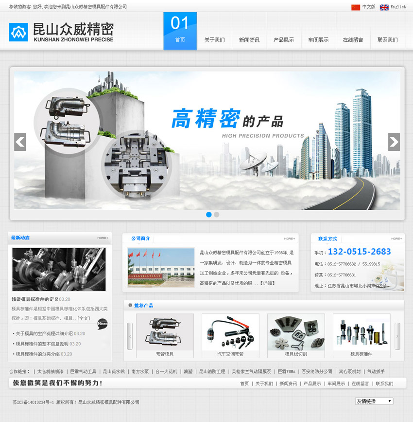 - 昆山众威精密模具配件有限公司创于1998年,是一家集研发设计,制造为一体的专业精密模具加工制造企业,多年来凭借先进的设备,完善的企业管理,以优质,高精密的产品服务于广大客户。目前本公司为多家大,中型企业配套生产各类精密模具,检具,模具标准件。