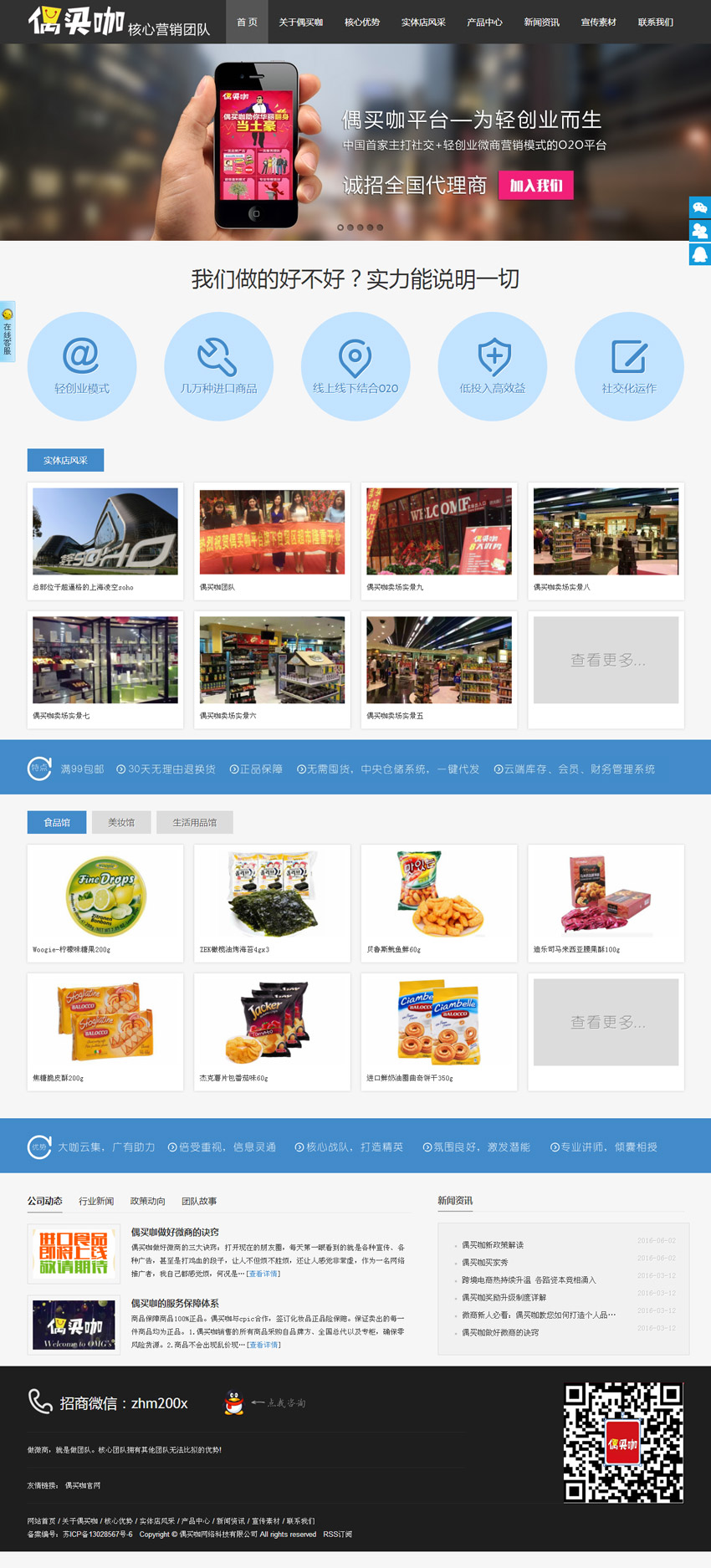 中国首家主打社交+轻创业微商营销模式的O2O平台,是由上海偶买咖网络科技有限公司控股,并负责运营管理,并与全球1000多家国际品牌结成战略联盟。偶买咖平台根据微商的发展瓶颈及趋势,确定了发展战略,打开了全新的社交+轻创业互联网模式,以免税店为基础实现一键实现微商轻创业,打造国内最具诚信、品质、社交的微商平台。并在运营中不断改进、创新使得公司的模式以及理念走在了国内的前沿。这是全新的一个微商平台,微商加入平台可以拥有自己的免税店铺,店里包含了母婴、美妆、食品、保健品、奢侈品、服装、鞋子、进口汽车等等最畅销的数万种全进口产品。平台提供宣传、客服等售后保障,从而实现一键轻创业。